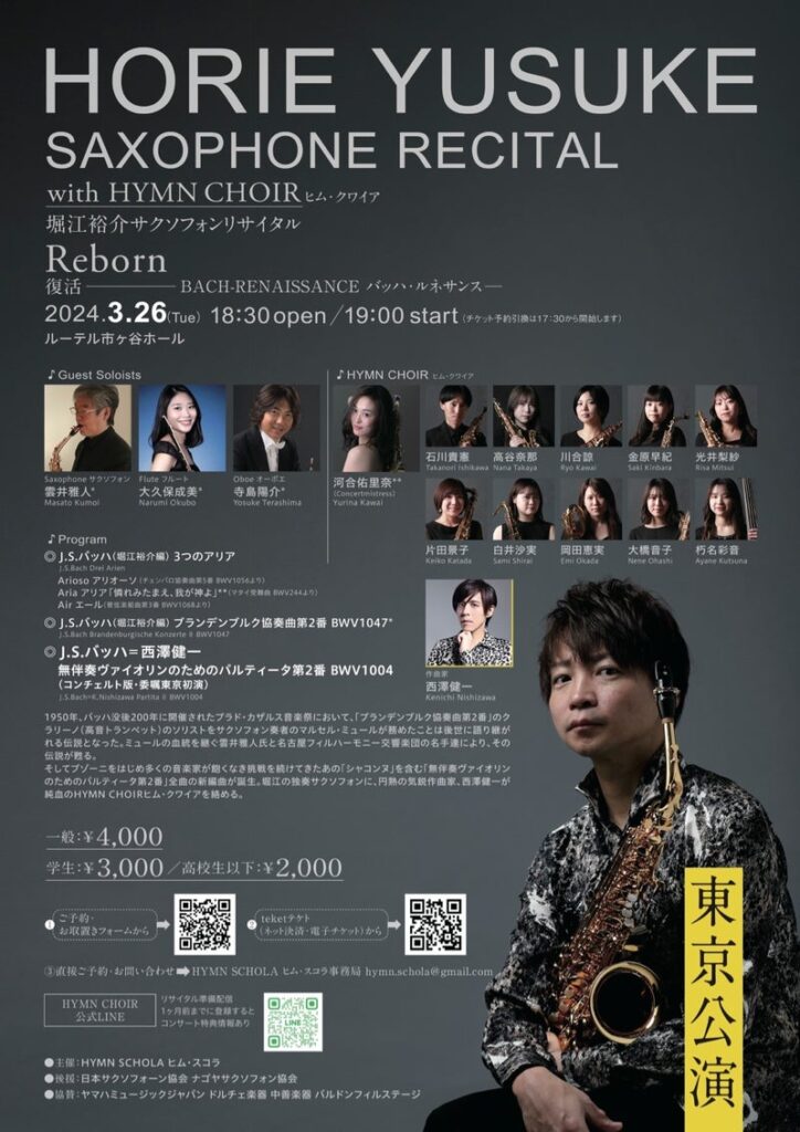 1950年、バッハ没後200年に開催されたプラド・カザルス音楽祭において、「ブランデンブルク協奏曲第2番」のクラリーノ(高音トランペット)のソリストをサクソフォン奏者のマルセル・ミュールが務めたことは後世に語り継がれる伝説となった。ミュールの血統を継ぐ雲井雅人氏と名古屋フィルハーモニー交響楽団の名手達により、その伝説が甦る。そしてブゾーニをはじめ多くの音楽家が飽くなき挑戦を続けてきたあの「シャコンヌ」を含む「無伴奏ヴァイオリンのためのパルティータ第2番」全曲の新編曲が誕生。堀江の独奏サクソフォンに、円熟の気鋭作曲家、西澤健一が純血のHYMN CHOIRヒム・クワイアを絡める。